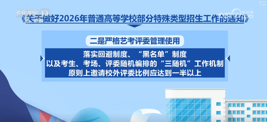 《通知》明確,一要設定考前輔導“禁區(qū)”,開展特殊類型招生的相關高校及其內(nèi)設學院、教職工不得組織、參與或自行開展相關考前輔導、應試培訓。二是嚴格藝考評委管理使用,落實回避制度、“黑名單”制度,以及考生、考場、評委隨機編排的“三隨機”工作機制,原則上邀請校外評委比例應達到一半以上。三是建立藝考評委專家?guī)?,一旦發(fā)現(xiàn)評委存在可能影響考試招生公平公正行為,堅決嚴肅查處并納入“黑名單”。
